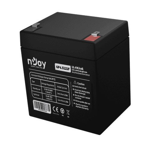Acumulator nJoy GP4.5121F 12V Capacitate 14,95W/cell evaluat la 1.65V/cell @ 15 min, Tensiune 12V, Tip VRLA, Caracteristici Sigilata complet si fara intretinere, Peste 260 de cicluri la 100% DOD, Utilizare standard 3-5 ani, Auto-descarcare redusa, Conectori : F1 – Faston Tab 187