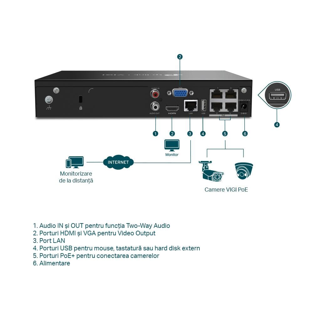 NVR PoE TP-Link VIGI 4 canale 1004H4P; 53W, 8 MP,1 SATA Interface, max 10TB, H.265+; ONVIF