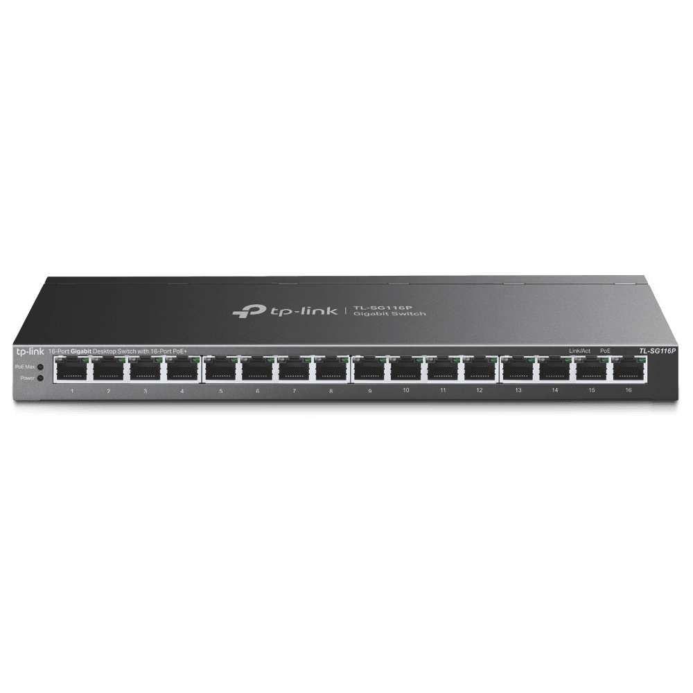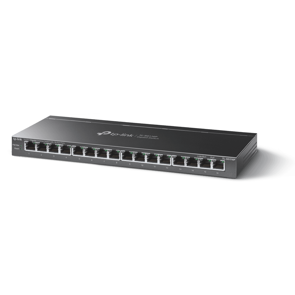 „16-Port Gigabit Desktop Switch with 16-Port PoE+ PORT: 16× Gigabit PoE+ Ports SPEC: 802.3at/af, 120 W PoE Power, Desktop Steel Case FEATURE: Extend Mode for 250m PoE Transmitting, Priority Mode for Port1-4, Isolation Mode, PoE Auto Recovery, Plug and Play”