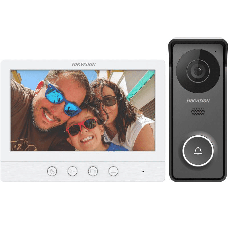 Kit videointerfon Hikvision DS-KIS213(B), caracteristici post exterior: IR: 3m, rezolutie: 1280 * 720@60fps, microfon si difuzor inclus, 1 buton, alimentare: 12 VDC, temperatura de functionare: -30° C to + 60° C, caracteristici post interior: ecran 7-inch colorful TFT, 4 butoane, rezolutie: 1024 x 600, alimentare: 12VDC, temperatura de functionare: -10° C to + 55° C.