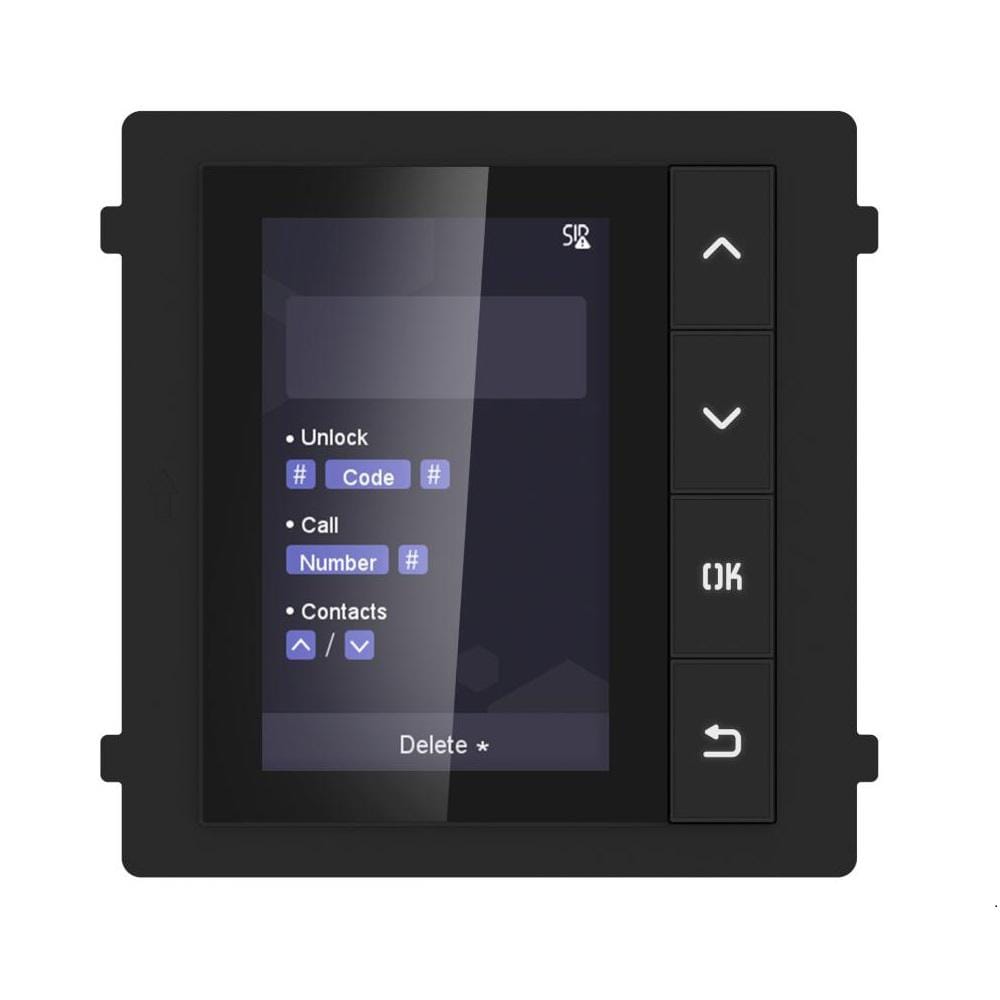 Modul de afisare pentru videointerfon modular Hikvision DS-KD-DIS; ecran LCD 3.5 inch, rezolutie 320x480P; 4 butoane de operare; memorie pentru 500 de contacte; apelare din lista de contacte; deschidere usa cu Pin cu ajutorul modului de tastatura( nu este inclus); montare aplicata sau ingropata; Dimensiuni: 98.5 mm × 100 mm × 34.2 mm;