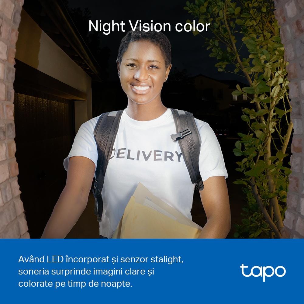 TP-Link Sonerie video smart TAPO D230S1, Senzor: 1/2.7“, Lentile F/NO: 2.1, IR pana la 7m, Rezistenta la ap: IP64, Unghi vizualizare: 160° pe diagonală, Rezolutie: 2K 5MP (2560 × 1920px), Compresie video: H.264, Microfon și difuzor încorporate, Standarde și Protocoale: IEEE 802.11b/g/n, 2.4 GHz, frecventa: 2.4 GHz, Dimensiunile camerei (Lx W x H): 5.7*0.21*1.3in (146*54,5*35,5mm), Dimensiunile hub-ului (L x l x H): 2,8 x 2,8 x 1,2 in (71,45*71,45*31,25 mm).